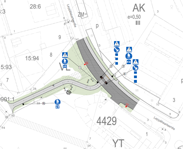 Työn vuoksi jalankulun ja pyöräilyn väylä suljetaan talven ajaksi. Leppäkaarteentielle tuleva suojatiesaareke ym. katualueella tehtävät työt tehdään ensi kesänä.